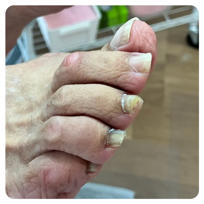個人差はございますが、初回のケアで「痛くなくなった!」「もっと早くくればよかった」と感動される方が多いです。当サロンでは、まずは今ある痛みを緩和することを最優先にケアします。そのうえで、歩行機能を維持し、将来も快適に歩き続けられる足元づくりを目指しています。